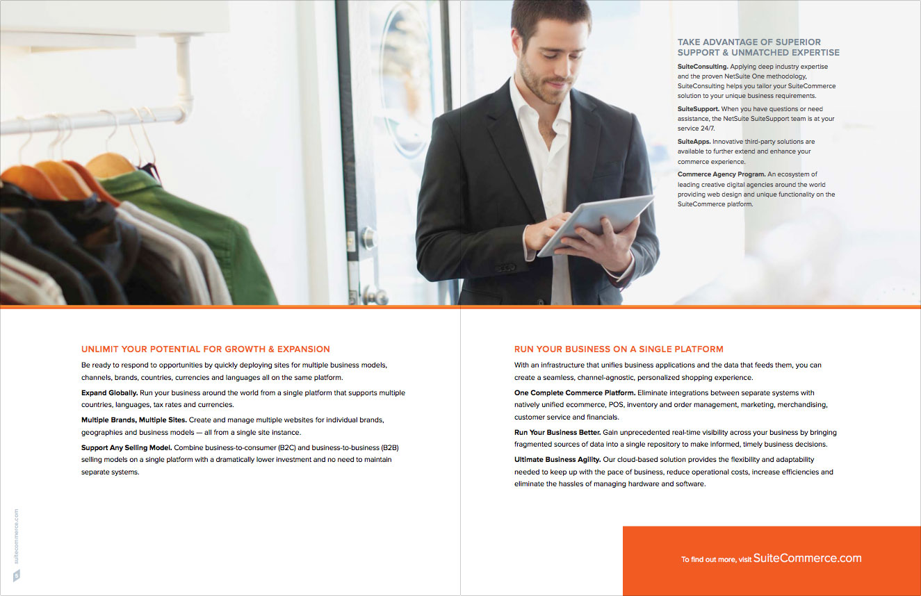 Design of a brochure, available in print and as downloadable pdf, promoting a complete ecommerce solution.